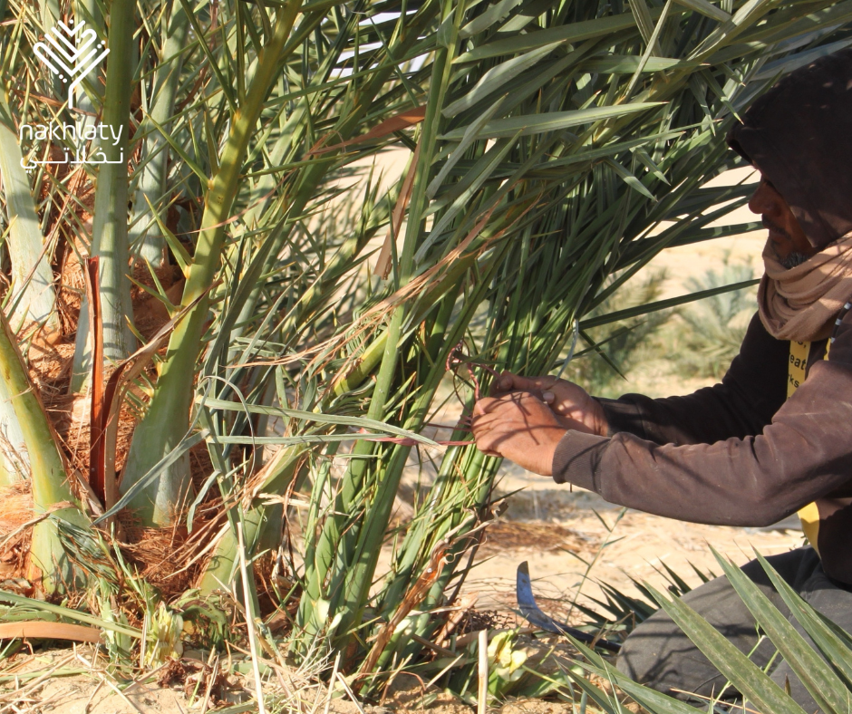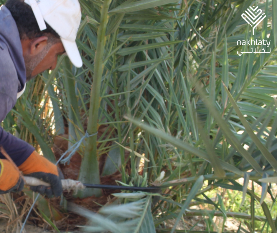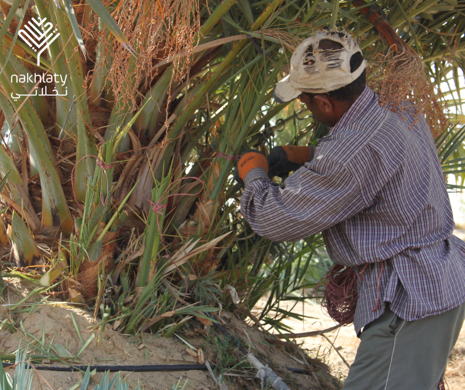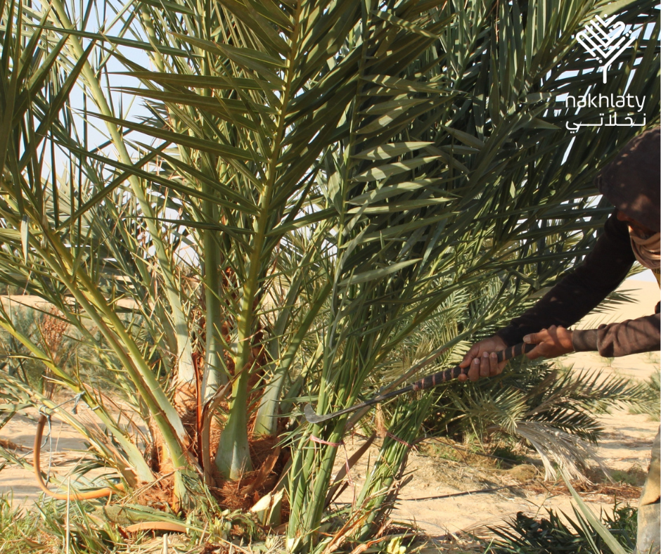 عمليات تجهيز فصل الفسائل في موسم ابريل ٢٠٢٥، لتكون صالحة للزراعة بنمو جذري وخضري متكامل. يتم تقليم الفسائل بواسطة نخالين محترفين في إدارة نخلاتي الزراعية، ثم يتم الترديم عليها وتربيطها وأخيراً إجراء عملية الرش الضرورية.
